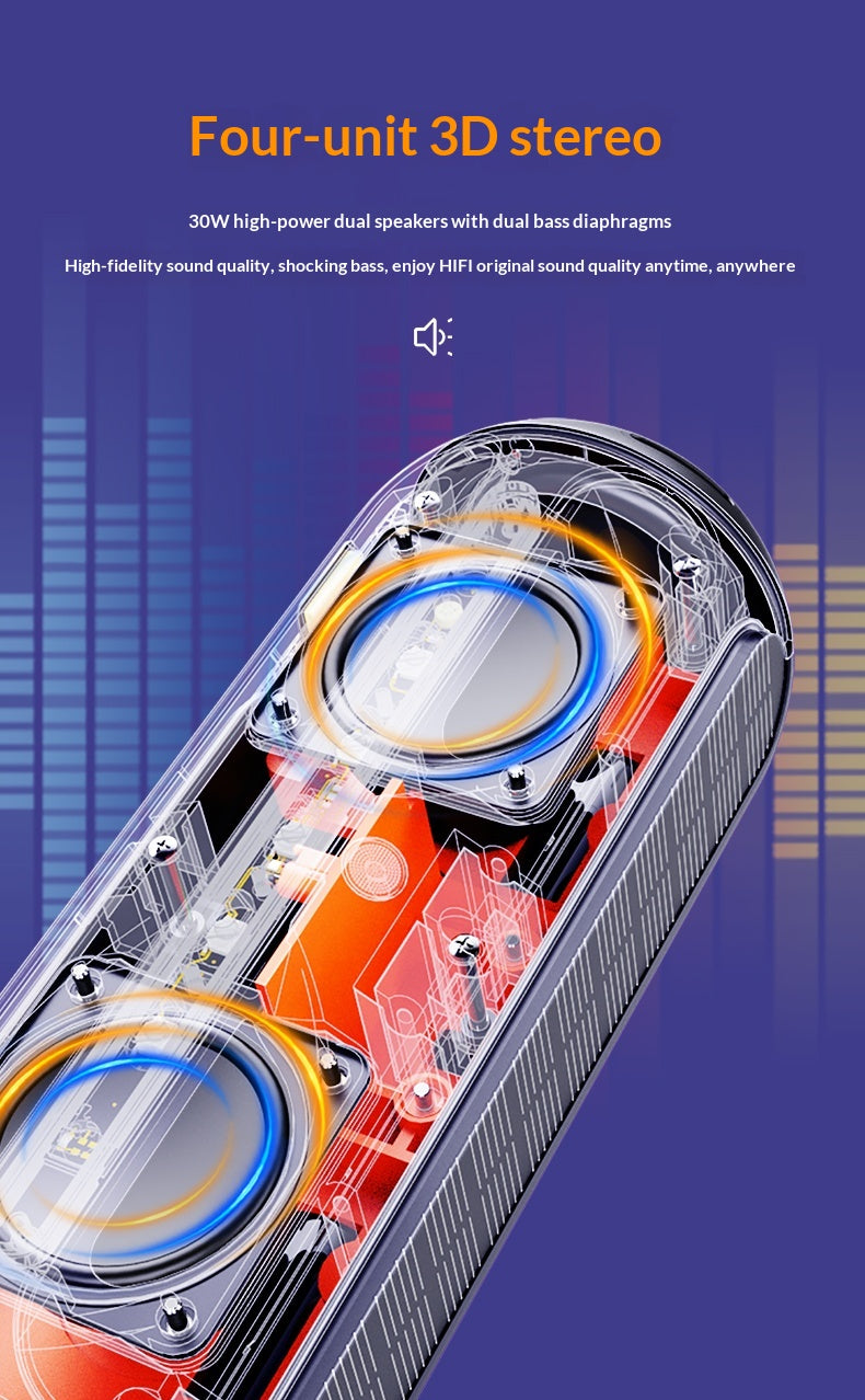 Product Information: Dimensions: 218x75x75mm Extended storage: 64GB Function: HIFI sound effect lighting Receiving distance: 10 meters or less Bluetooth version: 5.1 Speaker structure: 2.0 Material: Plastic Playback format: MP3 TF card Rated power: 30W Charging interface: Type-C Packaging list: Audio system + charging cable + instruction manual *1